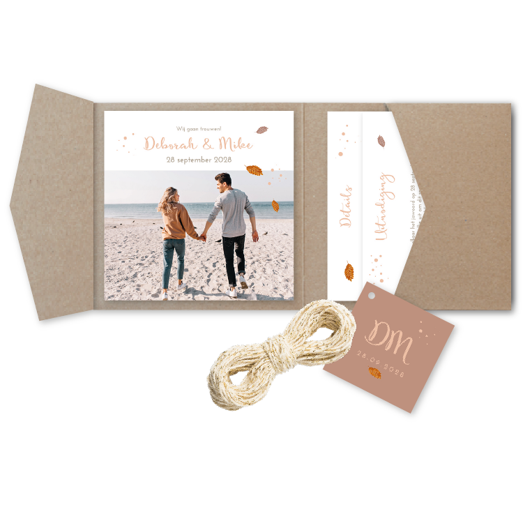 Heerlijk herfstgevoel met deze Pocketfold Trouwkaart Foto herfst blaadjes rosefolie! De warme kleurencombinatie van beige, brons en rosé geeft deze bruiloftsuitnodiging een stijlvolle uitstraling. Bovendien kun je deze uitnodiging personaliseren met een foto van jullie als koppel.