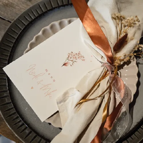 Een menukaart met een krans van getekende bloemen, palmgras en rosefolie en hartjes.