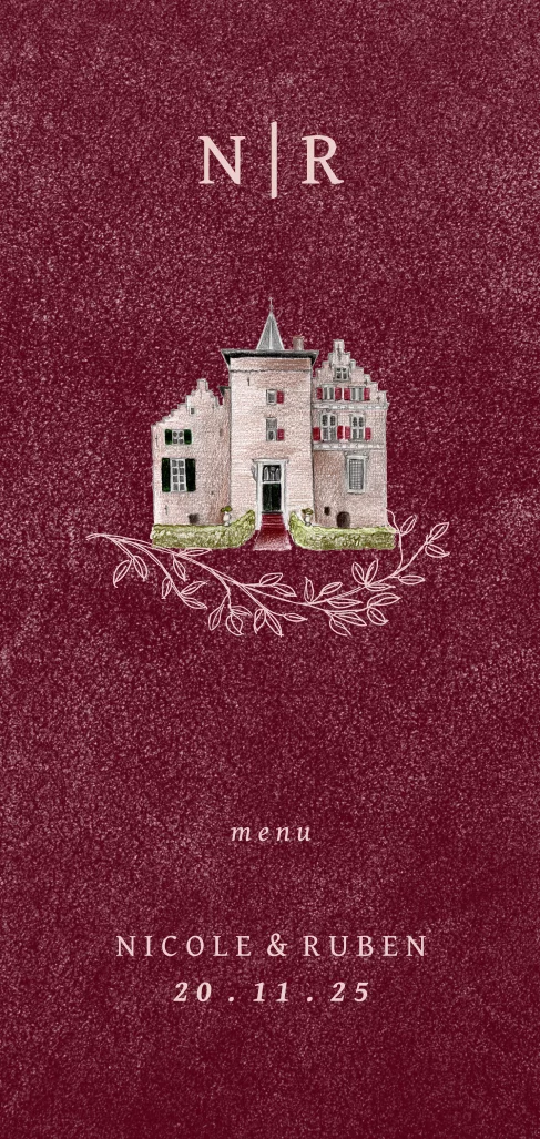 Menukaart chique bordeaux met getekende trouwlocatie wijenburg Modern, handgetekend en chique!