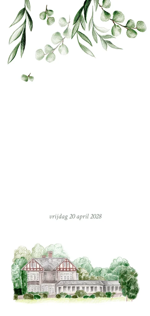Romantische menukaart met trouwlocatie met groene blaadjes en koperfolie.