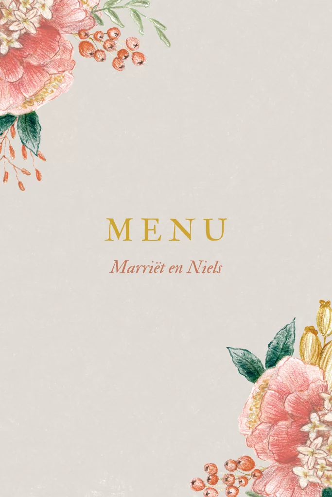 Een menukaart met klassiek getekend Bloemen in beige