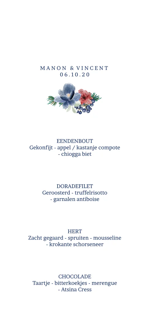 Mooie klassiek menukaart met rood en blauwe bloemen voor een winterbruiloft!