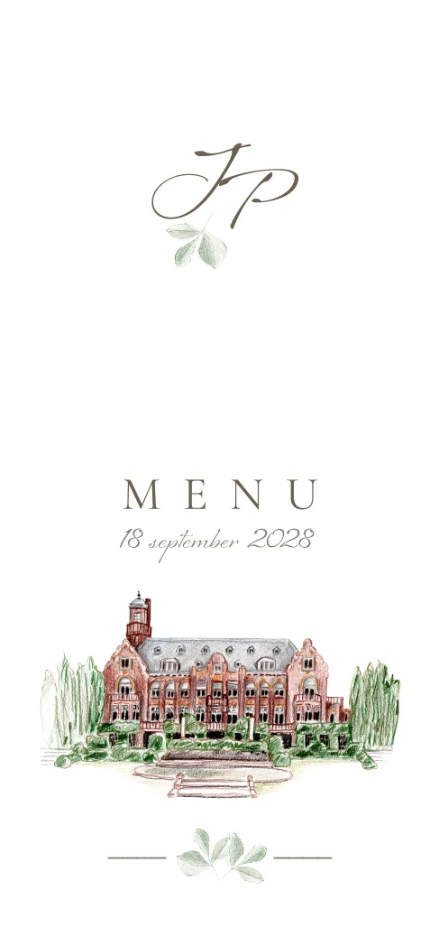 Menukaart staand Getekende Trouwlocatie Kasteel de Hooge Vuursche