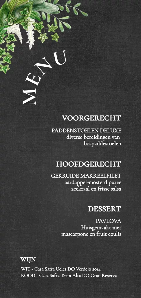 Menukaart met getekende botanische krans met goudfolie. Modern, handgetekend, tijdloos en chique!