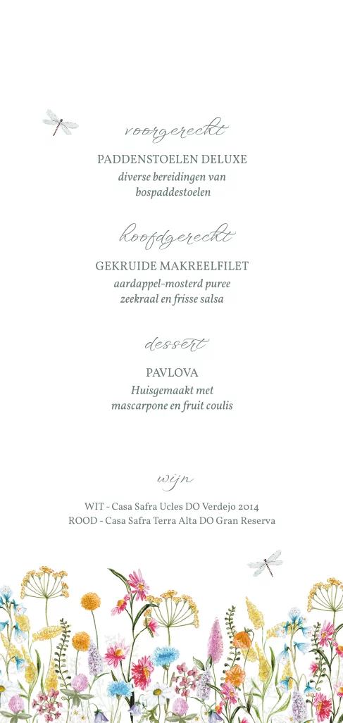 Als je op zoek bent naar een stijlvolle en romantische menukaart, dan is deze menukaart met veldbloemen, libelle's en hartje perfect voor jou!