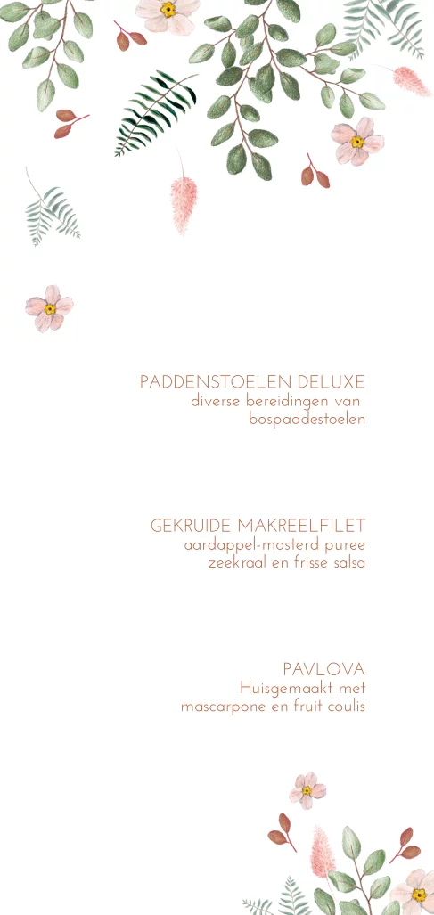 Extra informatie kaartje romantische menukaart met pastel bloemen en blaadjes