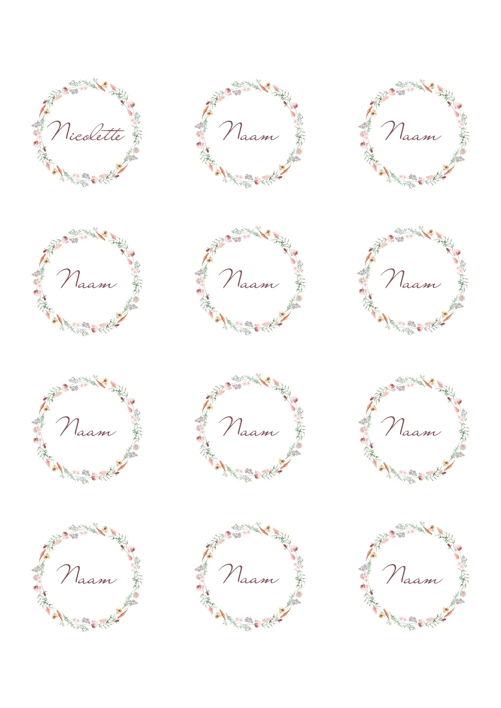 ronde naamkaartjes met een cirkel met kleine bloemetjes. De kaartjes zijn stans kaarten met een mooie bloemenprint. Ze zijn perfect voor een bruiloft of andere speciale gelegenheid.