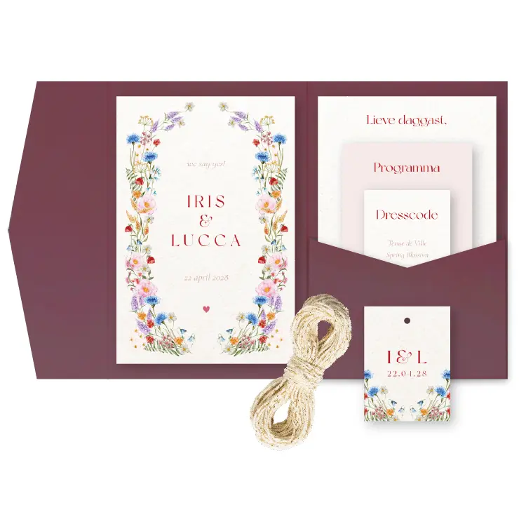 Kleurrijke Pocketfold trouwkaart bloemenrand rood blauw
