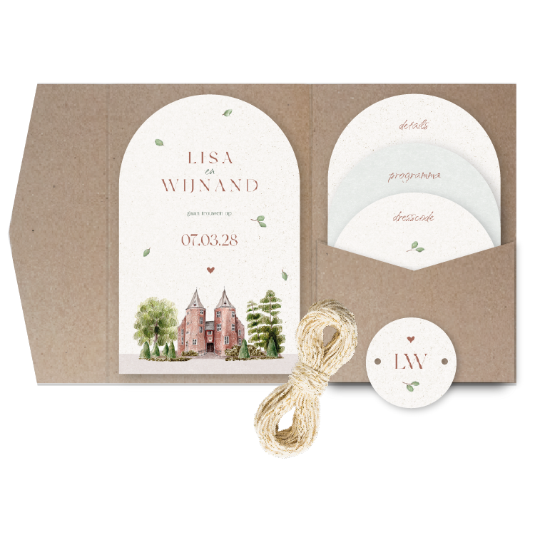 Deze Pocketfold trouwkaart met ronde bogen is een unieke en exclusieve trouwkaart. Deze trouwkaart is een echte eyecatcher en zal zeker in de smaak vallen bij je gasten. De combinatie van de getekende prachtige trouwlocatie Kasteel Dussen met blaadjes en letters met hoogglans maakt deze Pocketfold trouwkaart een perfecte keuze voor een onvergetelijke bruiloft.