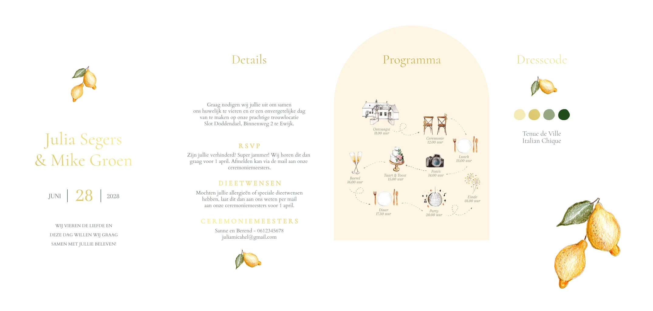 Deze Pocketfold trouwkaart met ronde bogen is een unieke en exclusieve trouwkaart. Deze trouwkaart is een echte eyecatcher en zal zeker in de smaak vallen bij je gasten. De combinatie van de getekende prachtige trouwlocatie Slot Doddendael met citroentjes en letters met goudfolie maakt deze Pocketfold trouwkaart een perfecte keuze voor een onvergetelijke bruiloft.