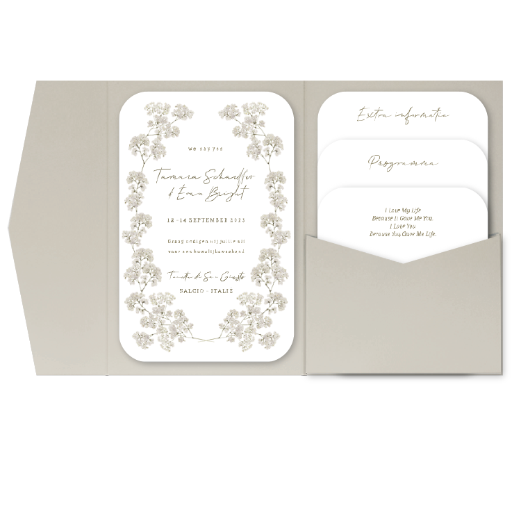 Pocketfold trouwkaart gipskruid locatie rondhoek