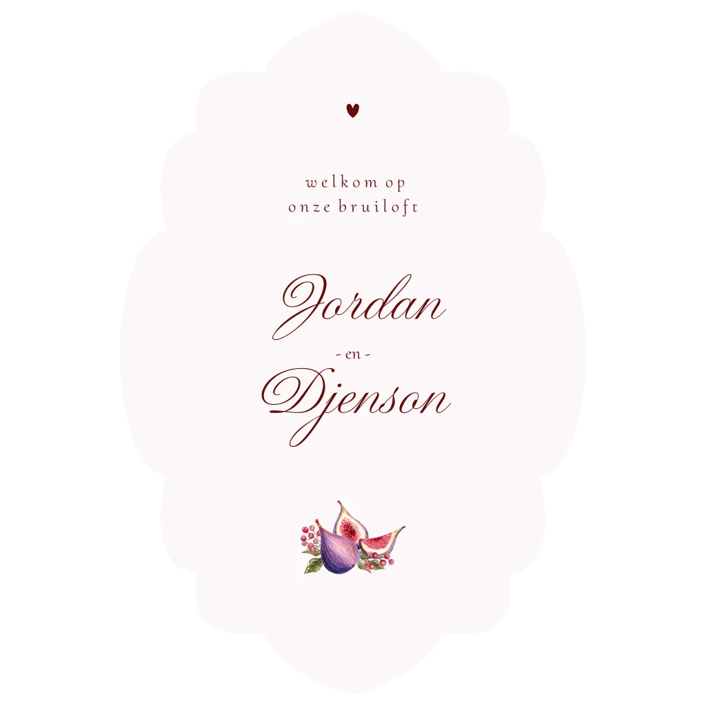 Verwelkom jullie gasten in stijl met dit elegante welkomstbord uit de Fleur de Figue collectie. De zachte botanische vijgenillustratie en verfijnde typografie geven meteen de warme, romantische sfeer van jullie bruiloft weer. Perfect voor bij de entree van de ceremonie, borrel of feestlocatie.