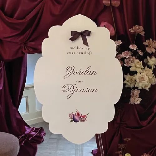 Verwelkom jullie gasten in stijl met dit elegante welkomstbord uit de Fleur de Figue collectie. De zachte botanische vijgenillustratie en verfijnde typografie geven meteen de warme, romantische sfeer van jullie bruiloft weer. Perfect voor bij de entree van de ceremonie, borrel of feestlocatie. Personaliseer eenvoudig jullie namen, datum en eventuele extra tekst in de editor en maak zo een uniek welkom dat volledig aansluit bij jullie trouwhuisstijl.- Materiaal is Forex en 5 mm dik