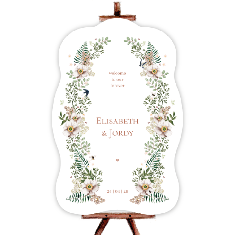 romantisch welkomstbord golvende vorm bloemen zwaluwen takjes