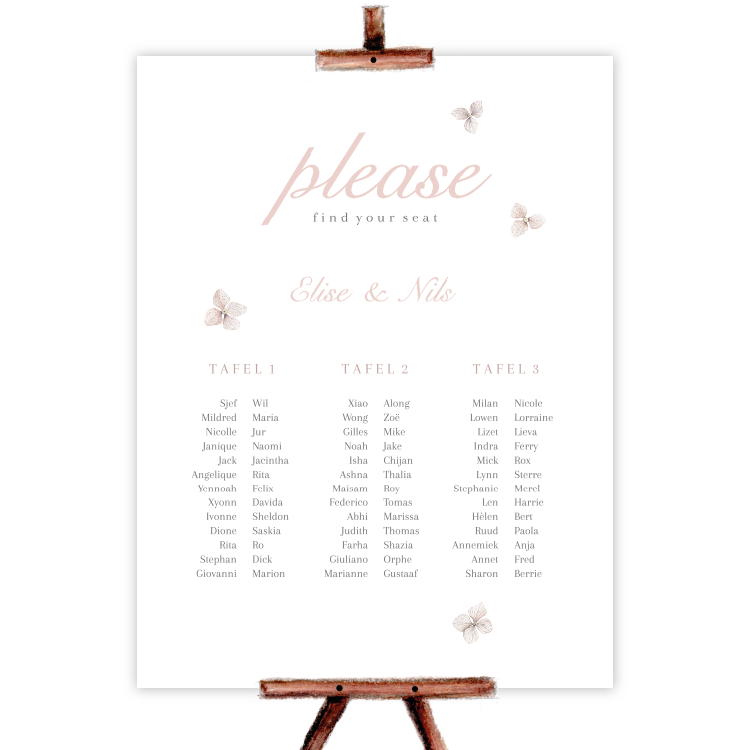 Bruiloftsbord seatingplan gedroogde bloemen hortensia bijbehorend bij de serie Delicate