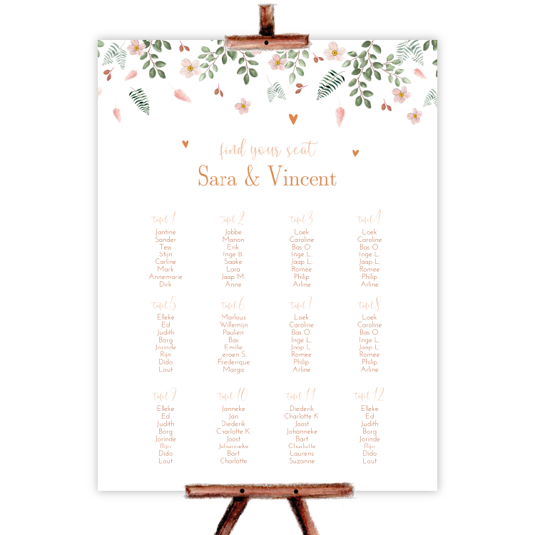 Bruiloftsbord Seatingplan uit de serie sweet romance roest met roestkleurige bloemen en blaadjes.