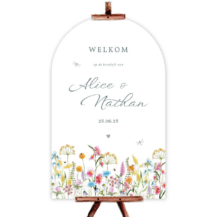 welkomstbord halfrond getekende veldbloemen