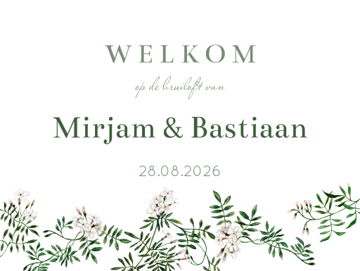 Welkomstbord jasmijn bloemen takjes.Dit stijlvolle bruiloftsbord is een echte blikvanger! Het bord is bedrukt met jasmijn bloemen takjes op 5mm forex.