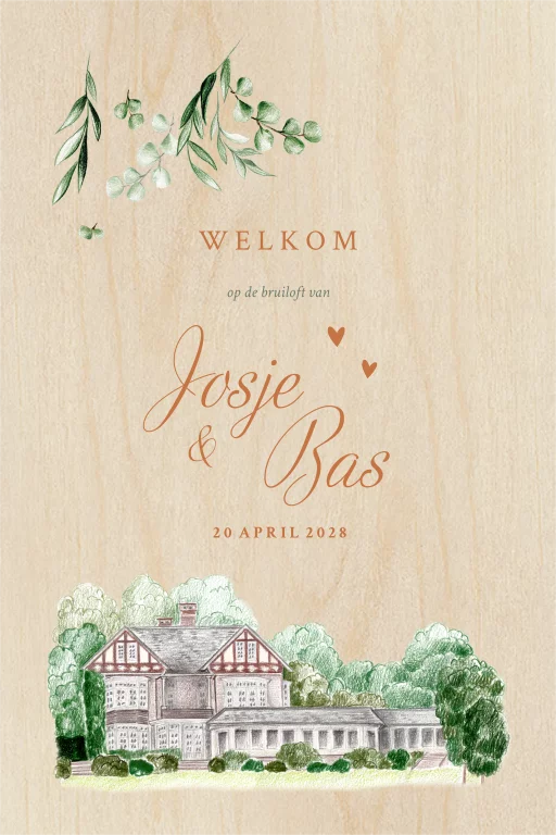 welkomtbord hout vallende takjes trouwlocatie 40x60