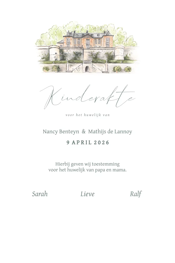 Maak je eigen kinderakte voor het betrekken van jullie kinderen bij jullie huwelijk. Deze kinderakte pas bij de trouwhuisstijl trouwlocatie Chateau Neercanne.