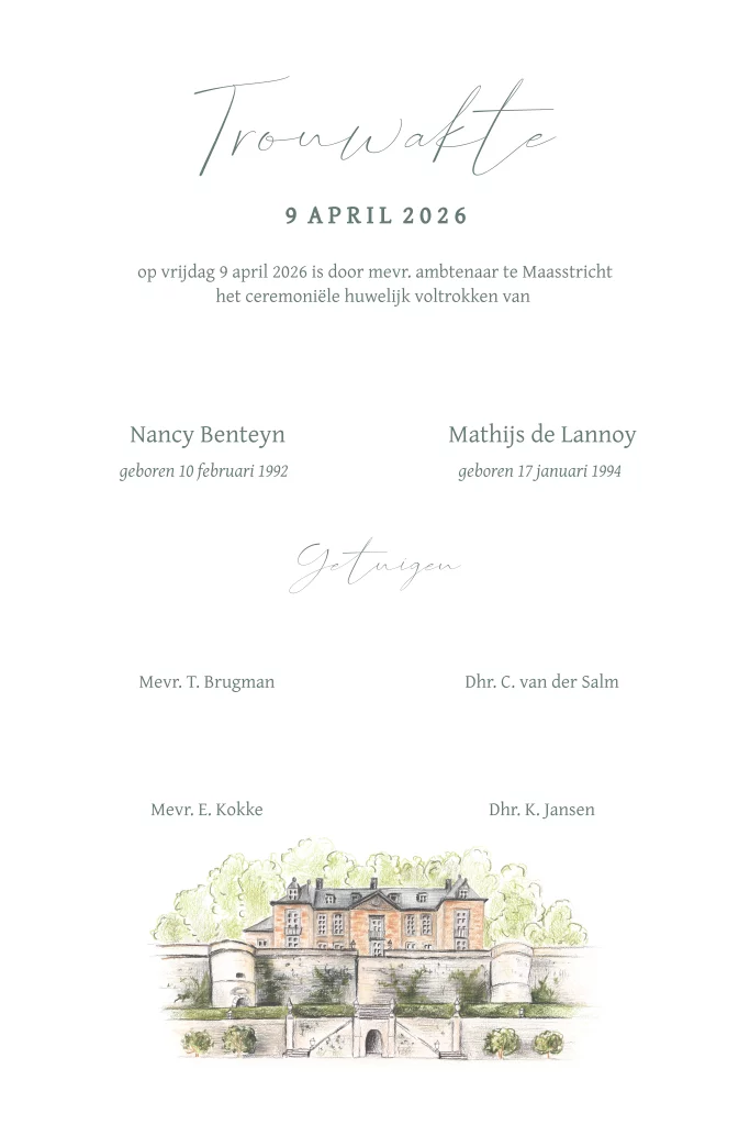 Maak je eigen trouwakte voor het voltrekken van jullie ceremonieel huwelijk. Deze trouwakte pas bij de trouwhuisstijl trouwlocatie Chateau Neercanne.