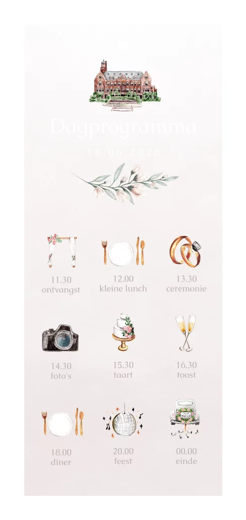 Programmakaart met tijdlijn, icoontjes bijbehorend bij de serie kader trouwlocatie.
