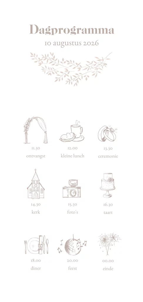 programmakaart met tijdlijn, icoontjes en met getekende takjes krans beige