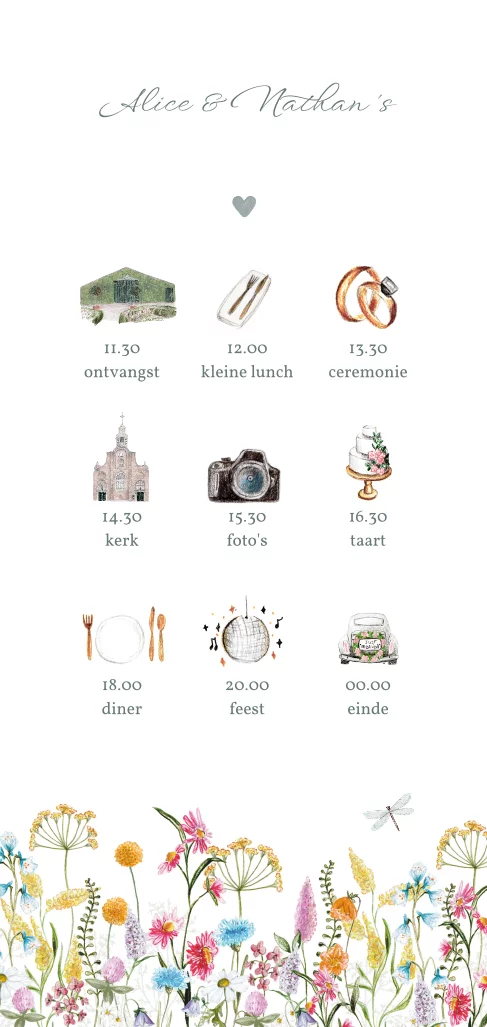 Programmakaart met tijdlijn, icoontjes bijbehorend bij de serie veldbloemen.