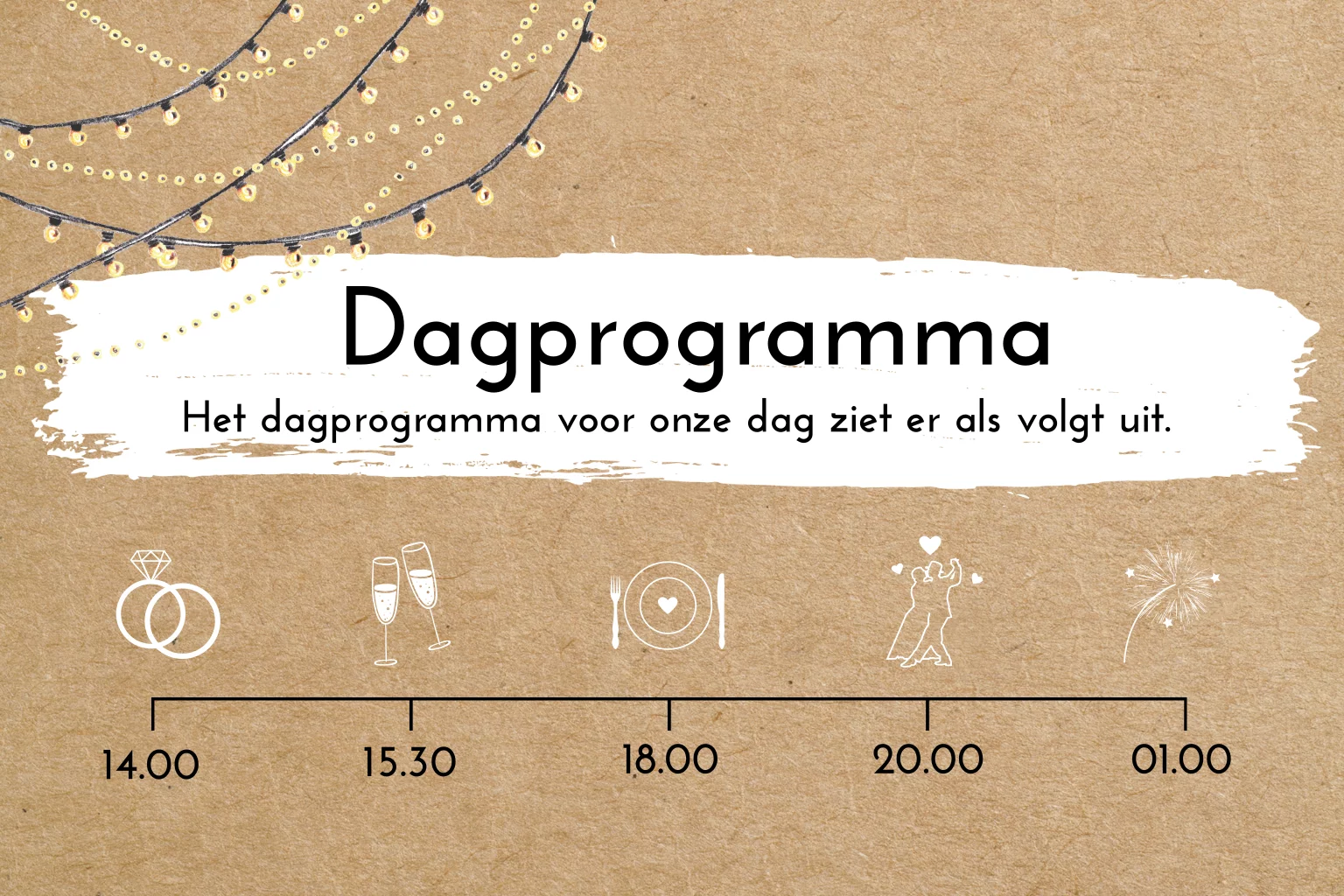Dagprogramma met icoontjes en een banner en slinger en lampjes.