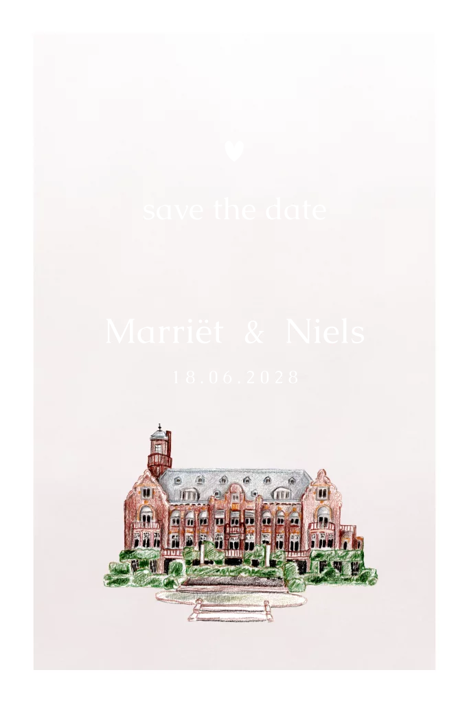 Klassieke save the date getekend met trouwlocatie de hoge vuursche met een kader. Modern, handgetekend en chique!