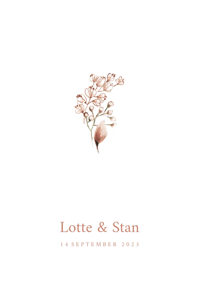 Een save the date kaart met een krans van getekende bloemen, palmgras en rosefolie en hartjes.