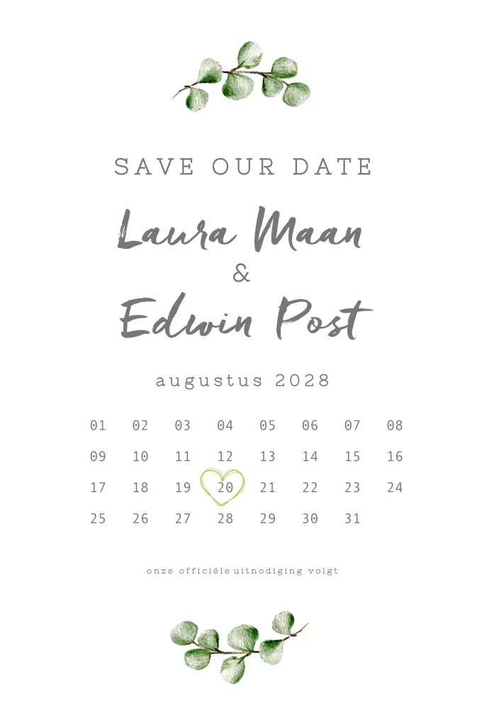 Deze save the date heeft een witte achtergrond met stijlvolle typografie met een mooi takje. Eenvoud siert deze kaart.