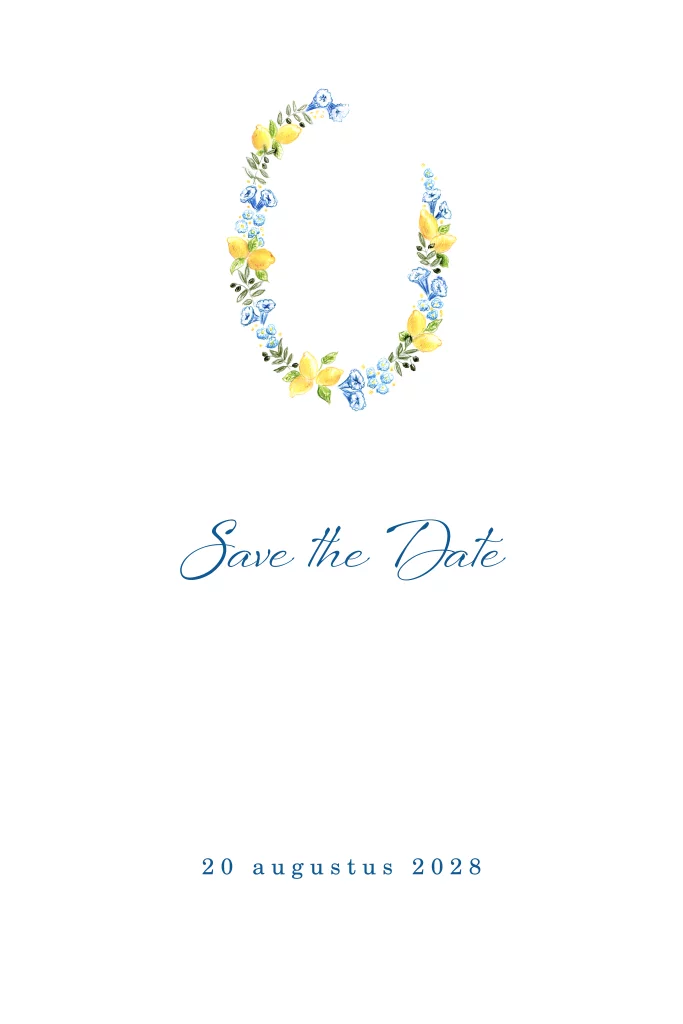 Een save the date kaart met getekende citroentjes en goudfolie bijbehorend bij de serie citroenenkrans.