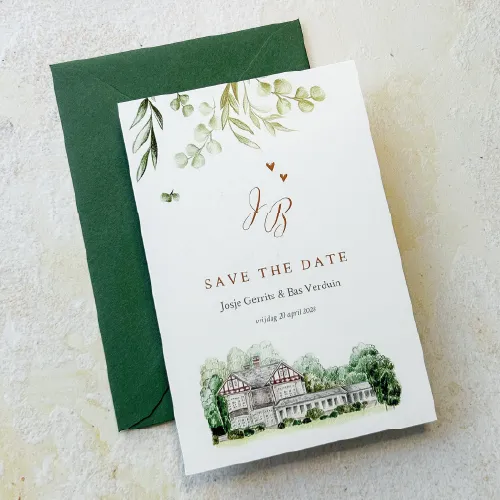 Romantische save the date kaart met trouwlocatie met groene blaadjes en koperfolie.