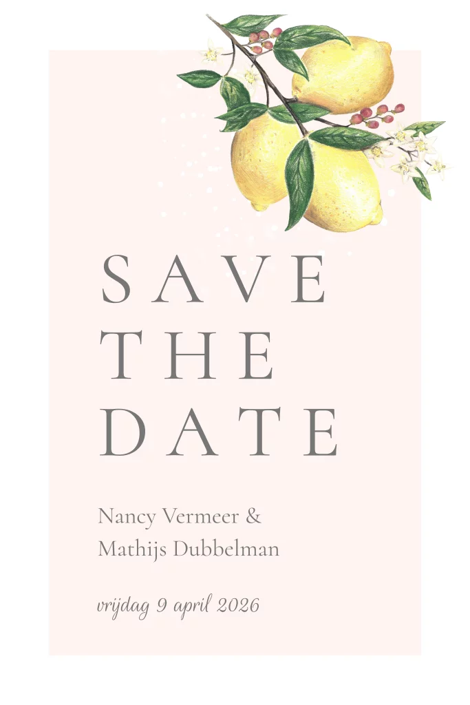 Stijlvolle save the date kaart met citroen. Modern, handgetekend en chique!