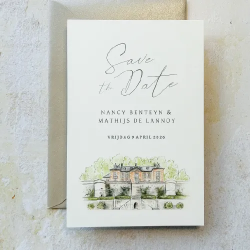 klassieke save the date getekend met trouwlocatie chateau.