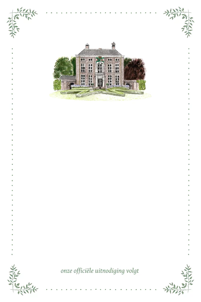 Stijlvolle save the date kaart trouwlocatie met goudfolie. In de editor kan je eenvoudig bij getekende locaties andere locaties vinden. Op deze trouwkaart is Landgoed de Havixhorst afgebeeld.