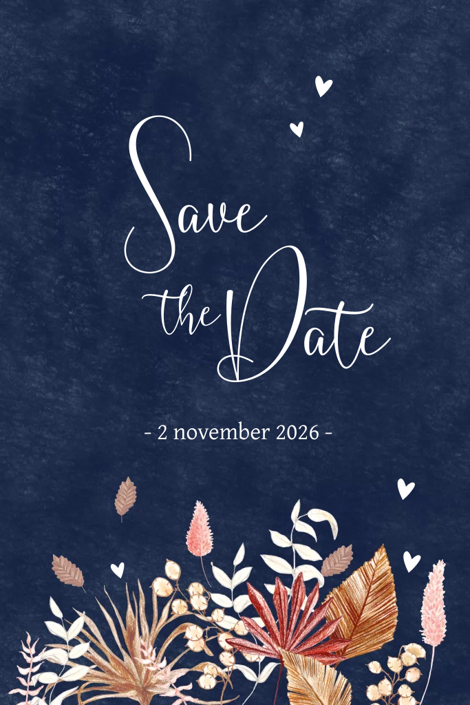 Donkerblauwe save the date rosefolie droogbloemen