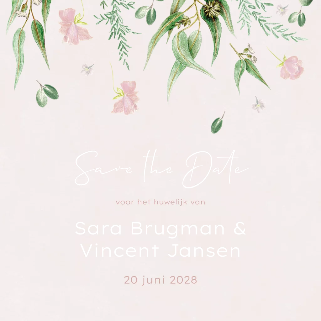 romantische save the date met pastel bloemen en blaadjes rosefolie