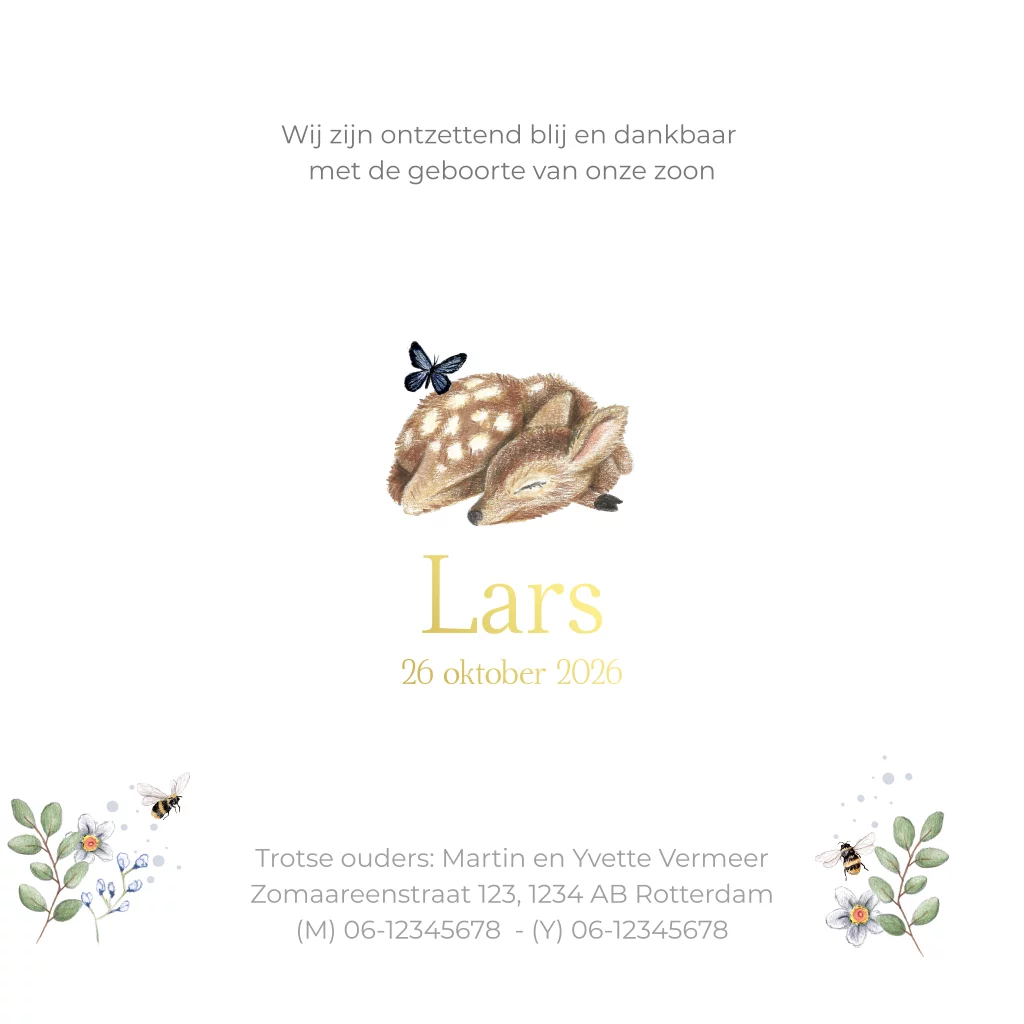 Op zoek naar een origineel getekend geboortekaartje? Dan is dit lieve kaartje geïllustreerd met hertje door Marjolein perfect voor jullie kleine ventje! Uniek door het doorkijkje en dan met het leuke strikje erop. Bestel het strikje los erbij.