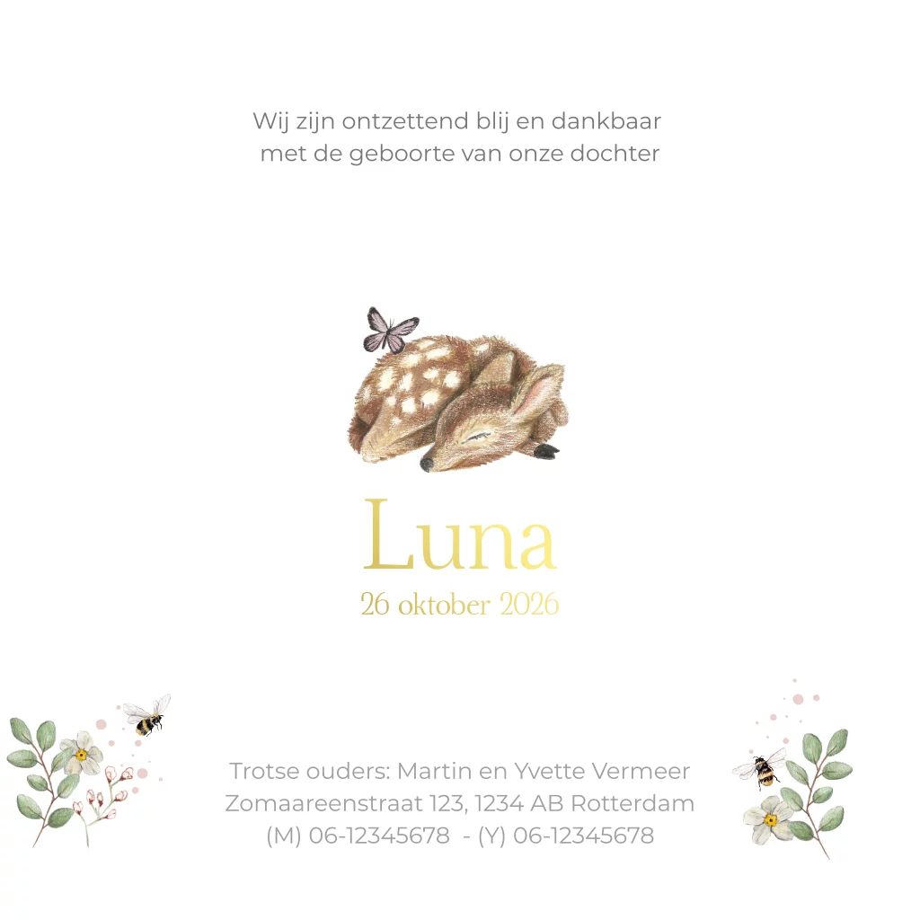 Op zoek naar een origineel getekend geboortekaartje? Dan is dit lieve kaartje geïllustreerd met hertje door Marjolein perfect voor jullie kleine meisje! Uniek door het doorkijkje en dan met het leuke strikje erop. Bestel het strikje los erbij.