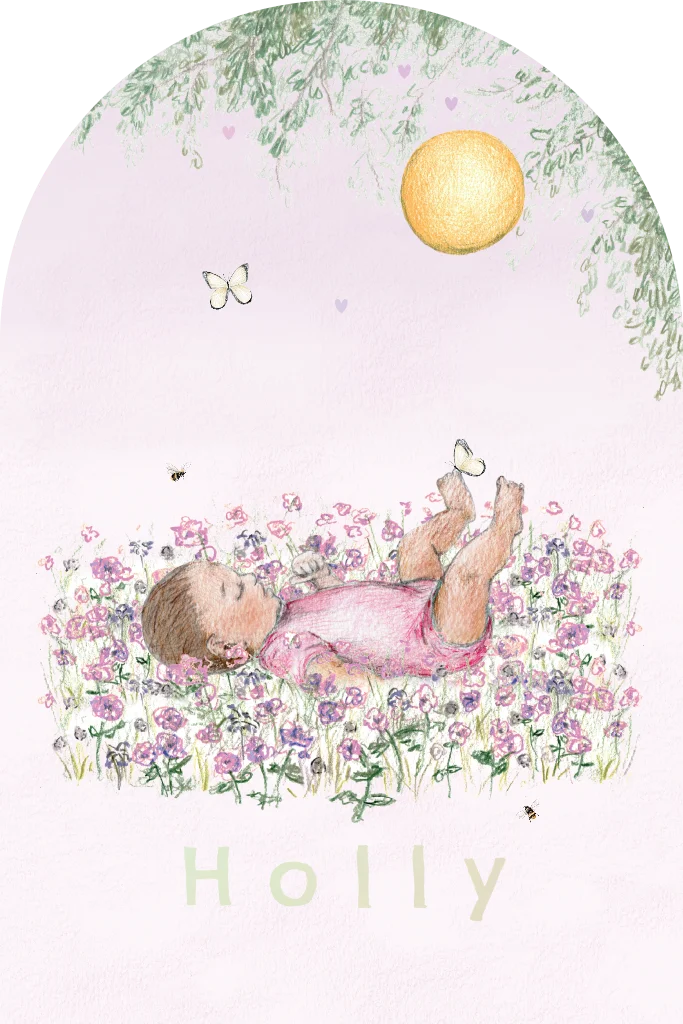 Dit halfronde geboortekaartje met lieve baby-illustratie is een unieke en sfeervolle manier om de geboorte van jullie kindje aan te kondigen. De handgetekende baby ligt dromend in een bloemenweide, omringd door vlindertjes en warm zonlicht. De zachte pastelkleuren en natuurlijke elementen geven het kaartje een rustige, poëtische en tijdloze uitstraling.