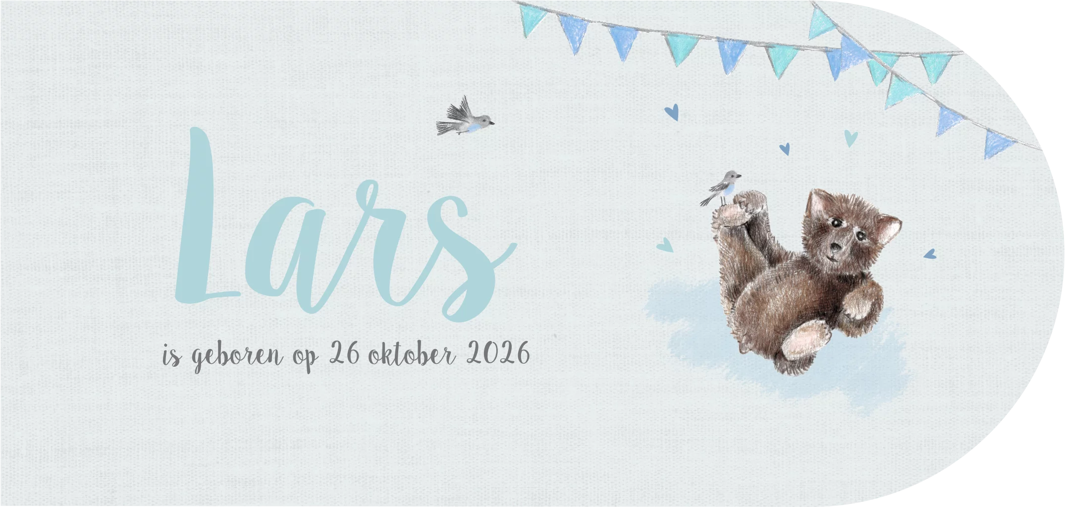 Op zoek naar een origineel getekend geboortekaartje? Dan is dit kaartje geïllustreerd met een beertje, slingers en speciale vorm perfect voor jullie jongen! Uniek, vrolijk en ontzettend lief.