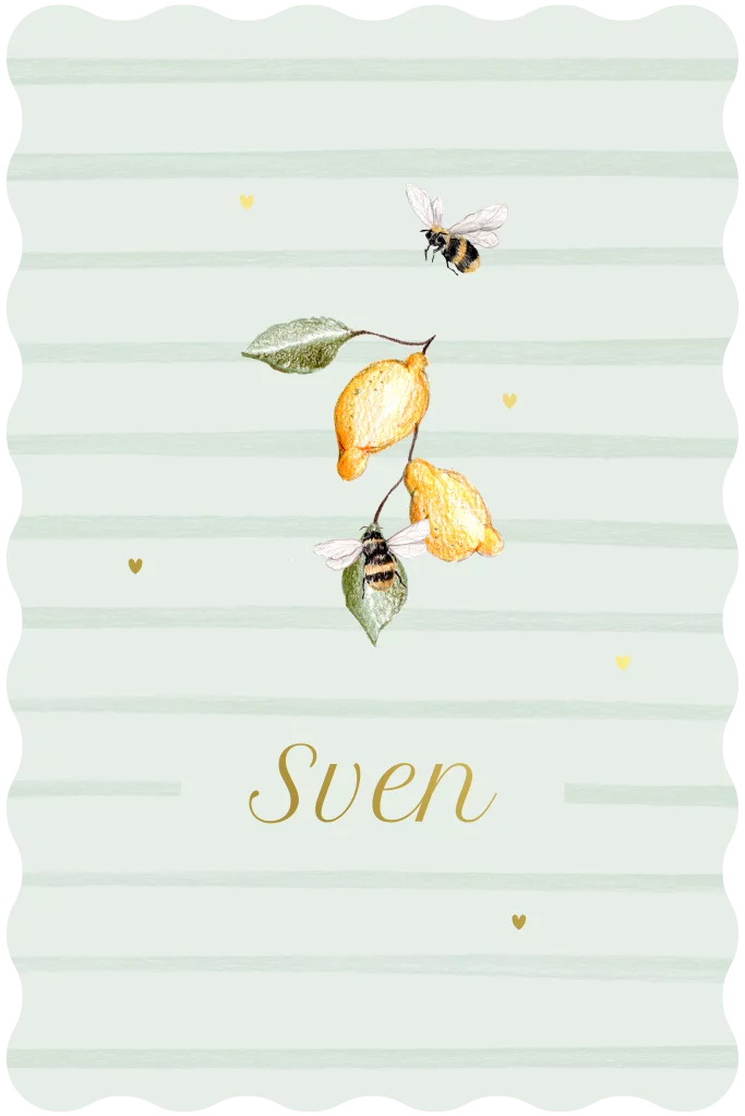 Geboortekaartje voor een jongen met streepjes, citroentakje met lieve bijtjes. Door de unieke golfjes vorm en toepassing met goudfolie is dit net even anders dan anders.