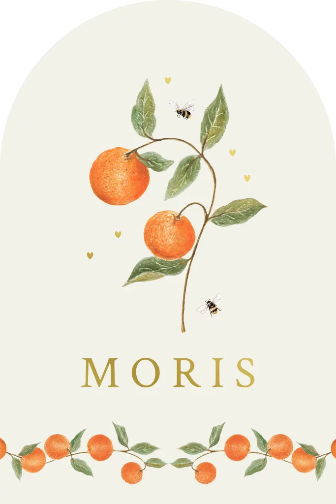Zoek je een uniek geboortekaartje? Kies dan voor dit geboortekaartje met sinaasappel en goudfolie! Het kaartje is gemaakt van stevig karton en heeft een mooie boogvorm. De sinaasappels en bijtjes zijn origineel gedrukt en geven het kaartje een retro en lief karakter. Het kaartje is geschikt voor een jongentje.