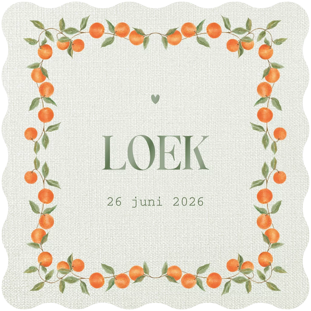 Op zoek naar een origineel geboortekaartje? Dan is dit kaartje met bijzondere golfjes vorm perfect voor een jongen. Leuk afgewerkt met een sinaasappeltjes rand met golfjes en hoogglans afwerking.