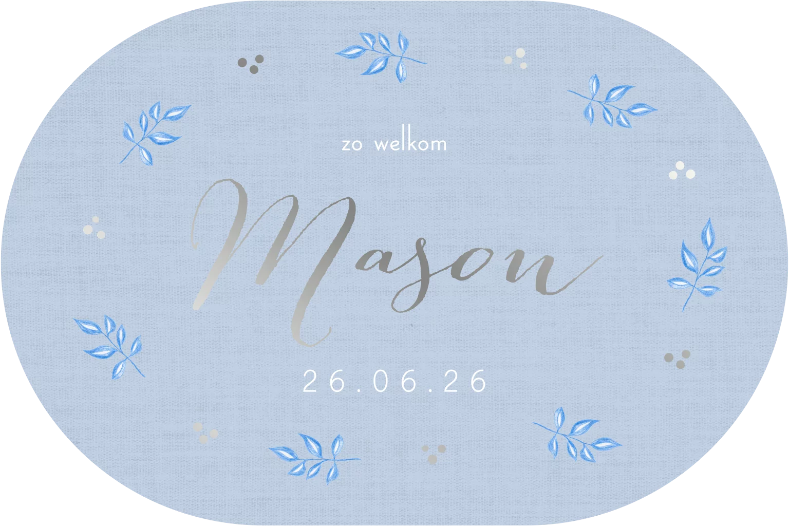 Op zoek naar een origineel getekend geboortekaartje afgewerkt met zilverfolie in bijzondere vorm? Dan is dit ovale kaartje geïllustreerd met takjes perfect voor jullie kleine ventje! Uniek, vrolijk en ontzettend lief.