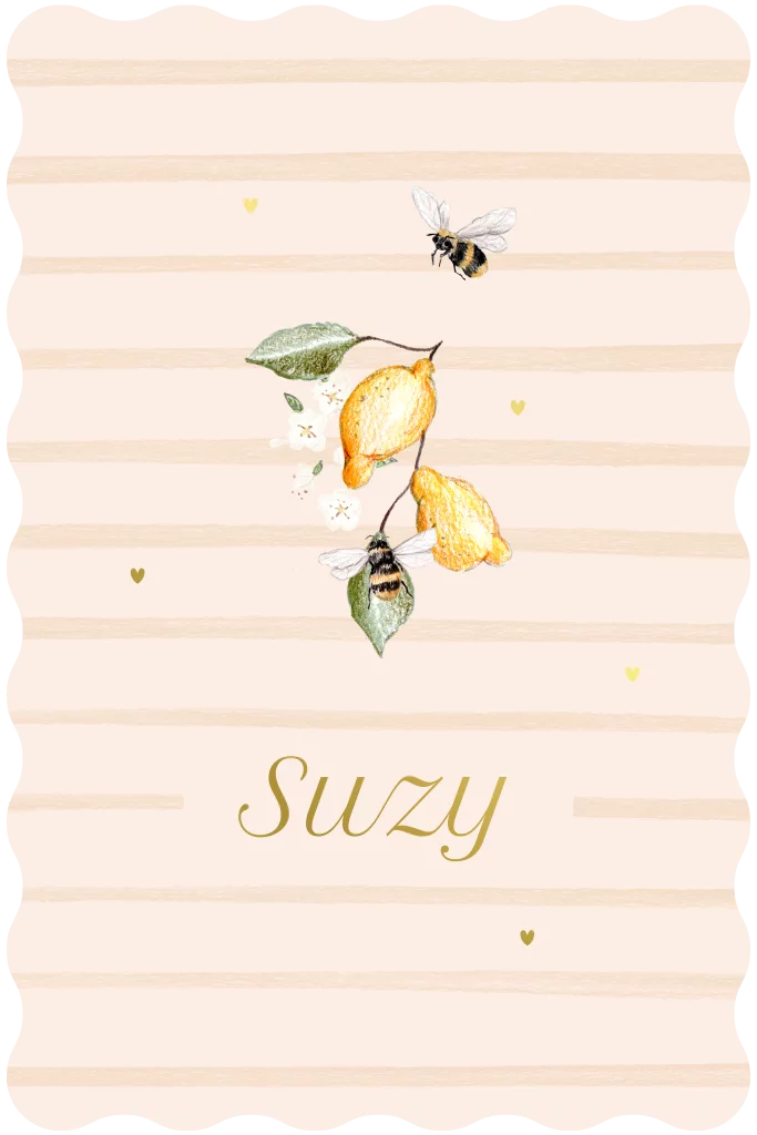 Geboortekaartje voor een meisje met streepjes, citroentakje met bloesem en lieve bijtjes. Door de unieke golfjes vorm en toepassing met goudfolie is dit net even anders dan anders.