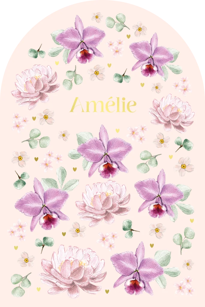 Dit geboortekaartje voor een meisje heeft een zachte en verfijnde uitstraling met illustraties van orchideeën en fijne bloemetjes. De afgeronde bovenkant geeft het kaartje een speels detail, terwijl de pasteltinten zorgen voor een rustige en lieve sfeer.