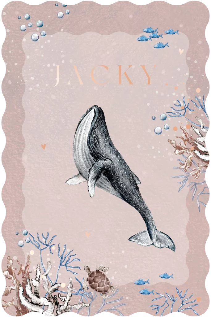 Op zoek naar een origineel getekend geboortekaartje? Dan is dit zeedieren kaartje geïllustreerd met een walvis met visjes en schildpad in een onderwater wereld wellicht wat voor jou? Door de unieke golfjes vorm en toepassing met goudfolie is dit net even anders dan anders.